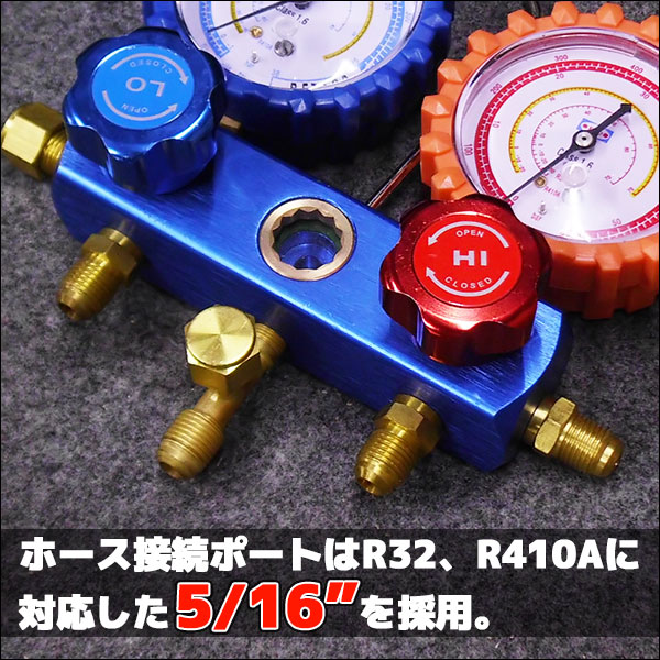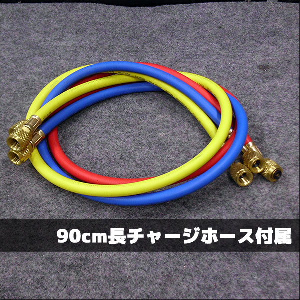| 仕様 | ●2バルブマニホールド ●サイトグラス付 ●チャージホース接続ポート:5/16" ●90cm長チャージホース付属 ●Bar(バール)、Psi(ポンド)表記 ※Bar(バール)表記は値を1/10すればMPa(メガパスカル)と同等の値になります。 1Bar=0.1MPaとなります。 |
